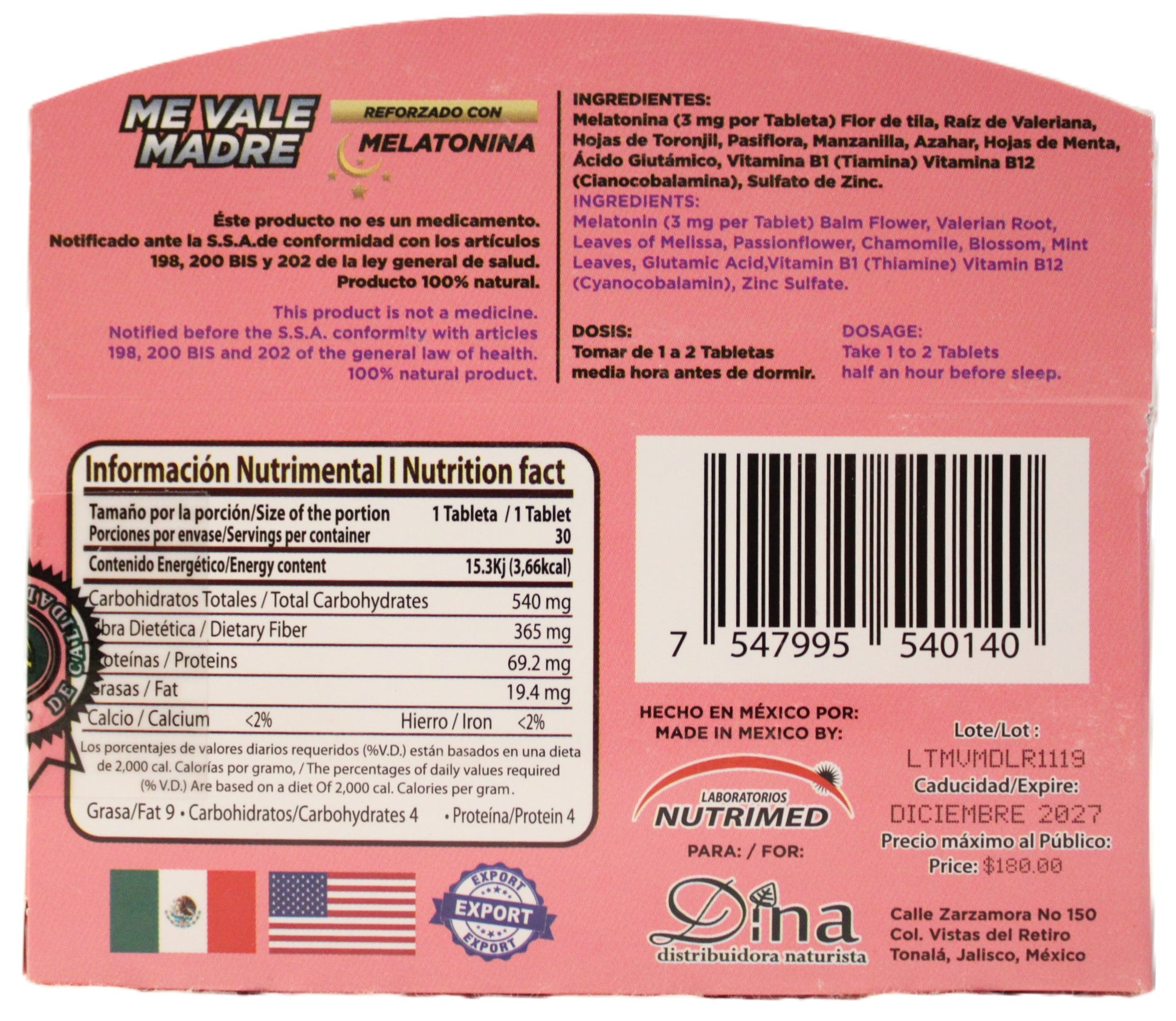 Me Vale Madre Reforzado Con Melatonina es una solución integral que combina melatonina con ingredientes naturales para optimizar tu ciclo de sueño y aliviar el estrés acumulado. La melatonina regula tu ritmo circadiano, facilitando un descanso profundo y reparador, mientras que los componentes adicionales trabajan para tranquilizar tu sistema nervioso. Perfecto para quienes enfrentan dificultades para dormir o necesitan recuperarse del agotamiento diario. Experimenta noches más tranquilas y días más productivos.